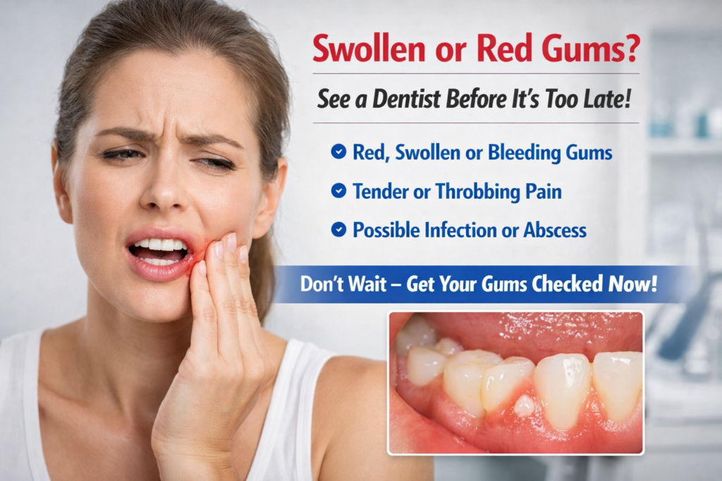Red flags that should prompt an immediate appointment are red or swollen gums that are tender to the touch. Swollen or inflamed gums may be a sign of infection or a dental abscess. If nothing is done, this infection can spread, causing teeth to loosen, leading to tooth mobility, or deeper infections that affect the bone beneath your teeth.
