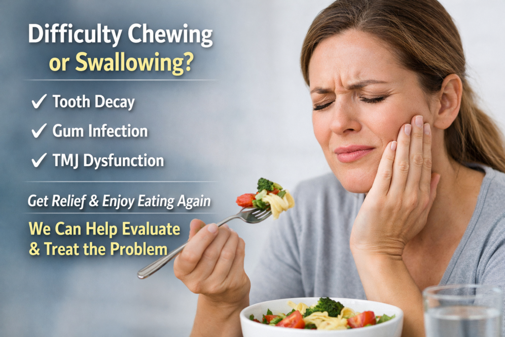If chewing food or swallowing is difficult, then this may be an indication that you are experiencing a problem with your teeth, gums, or jaw. Any of the following conditions may be affected: tooth decay, infection, or temporomandibular joint (TMJ) dysfunction.