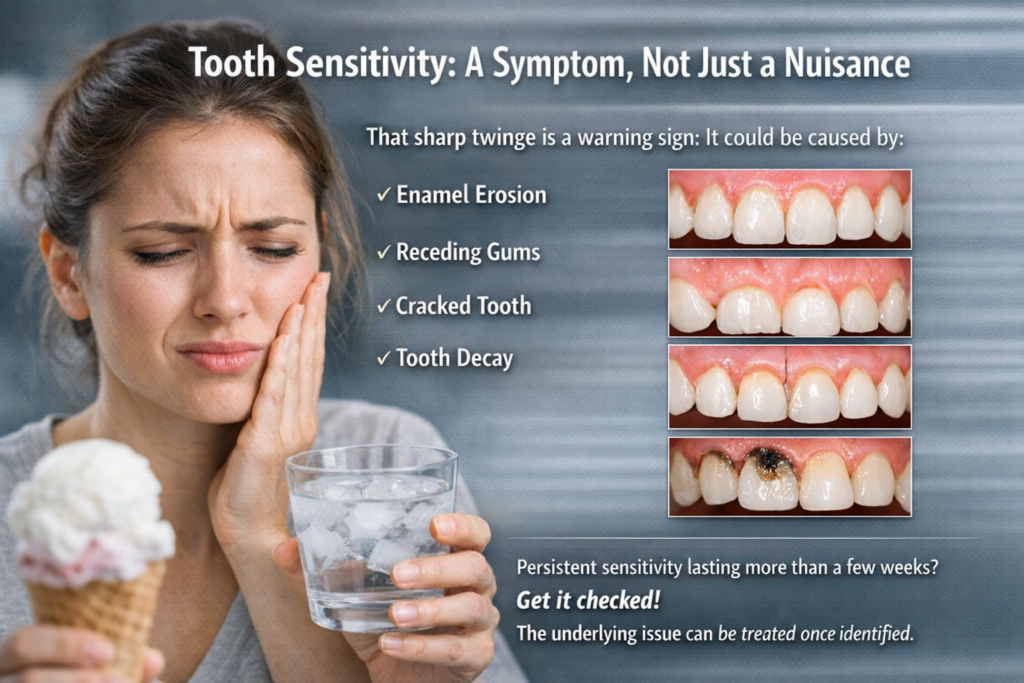 A sharp twinge when you sip ice water or bite into something cold is easy to dismiss as “just how your teeth are.” But sensitivity is usually a sign that something specific is happening: enamel erosion, gum recession, a small crack, or early-stage decay. Treating it as a standalone symptom with a sensitive toothpaste can mask the signal while the underlying issue worsens.